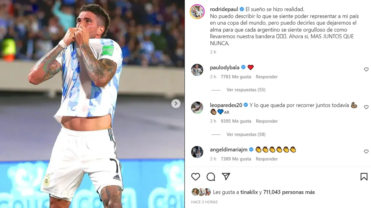 En sus redes, De Paul subió la lista de Scaloni y expresó: "El sueño se hizo realidad. No puedo describir lo que se siente poder representar a mi país en una copa del mundo, pero puedo decirles que dejaremos el alma para que cada argentino se siente orgulloso de como llevaremos nuestra bandera . Ahora sí, más juntos que nunca".