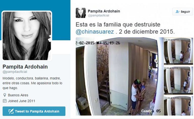 Luego de muchas idas y venidas, Pampita estalló de madrugada en su cuenta de Twitter. En ese momento Carolina Ardohain había descubierto la infidelidad de Vicuña y la China en el recordado episodio de la palta y la manta de Nepal adentro del motorhome. Al no poder aguantar más el enojo y la frustración por una relación que se terminaba de la peor manera, la modelo arremetió con imágenes de la cámara de seguridad de su casa en la que se puede ver a la familia que conformaban con Benjamín Vicuña y con uno de sus hijos.