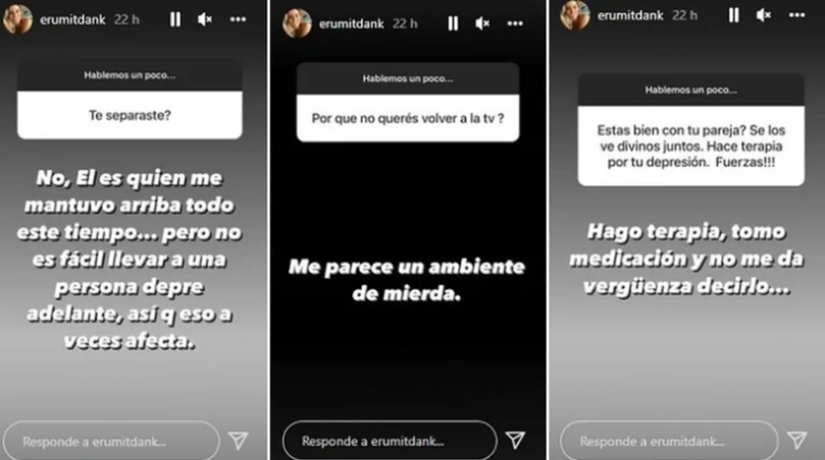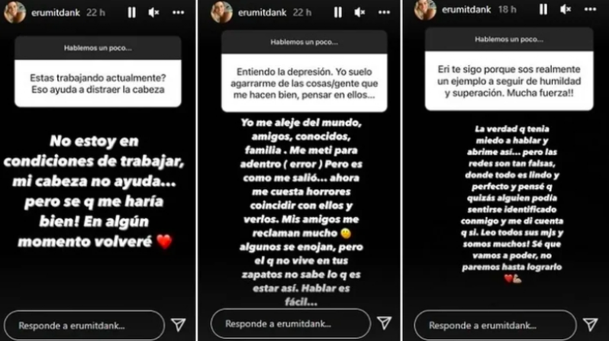"Me alejé del mundo, amigos, conocidos, familia. Me metí para adentro, un gran error. Pero es como me salió, y ahora me cuesta horrores coincidir con ellos y verlos", reconoció. Y continuó: "Mis amigos me reclaman mucho, algunos se enojan, pero el que no vive en tus zapatos no sabe lo que es estar así. Hablar es fácil...". En este sentido, cuando le consultaron si está bajo tratamiento, respondió: "Hago terapia, tomo medicación, y no me da vergüenza decirlo".