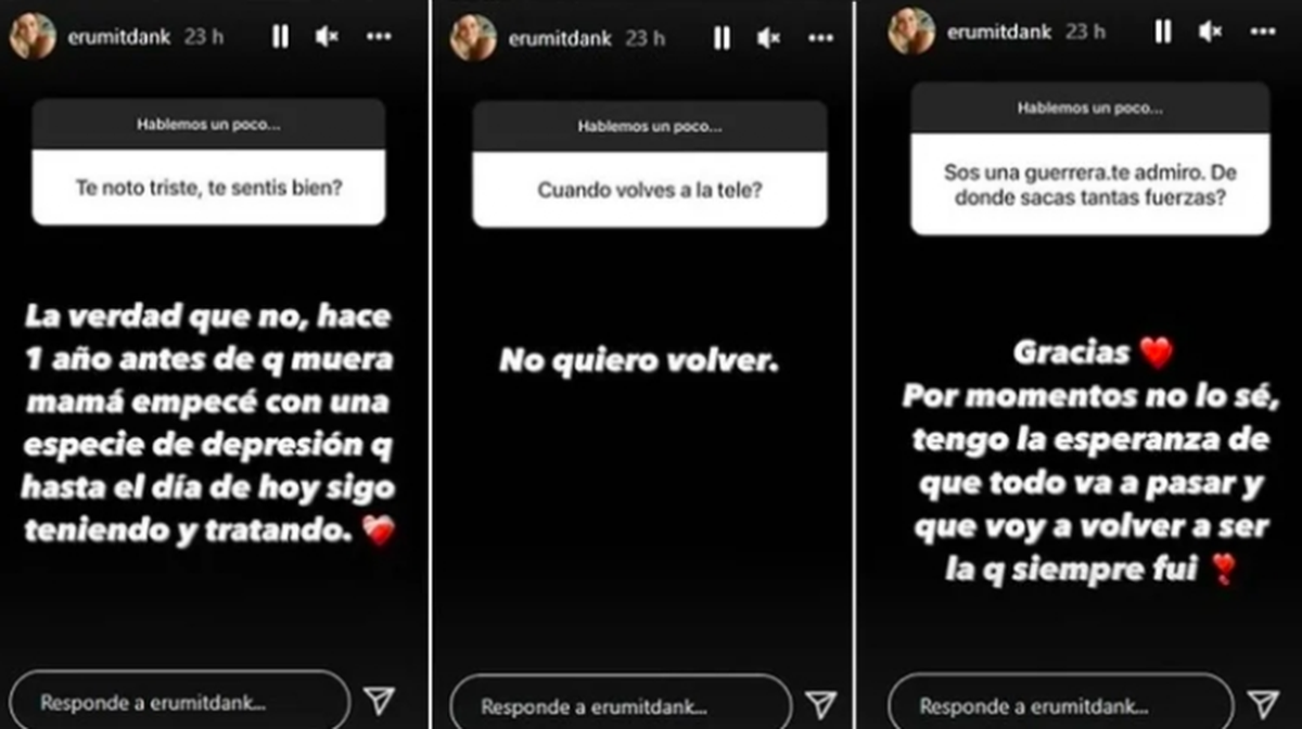 Érika Mitdank supo ser una importante figura del ambiente mediático luego de participar en Bailando por un sueño de ShowMatch y comenzar una relación con Ricardo Fort. Finalmente, y luego de un concurso que guiaba Marcelo Tinelli para conseguirle novia al chocolatero, Érika fue la elegida. Alejada de los medios de comunicación hace años, la modelo reapareció en las redes sociales y reveló el doloroso momento que atraviesa en la actualidad. "Te noto triste, ¿estás bien?", le preguntó un seguidor, a lo que ella respondió con honestidad: "La verdad que no, un año antes de que muera mamá empecé con una especie de depresión que hasta el día de hoy sigo teniendo y tratando".