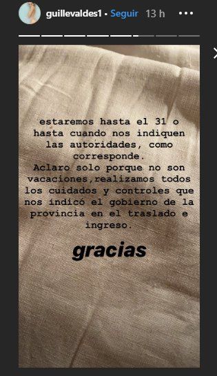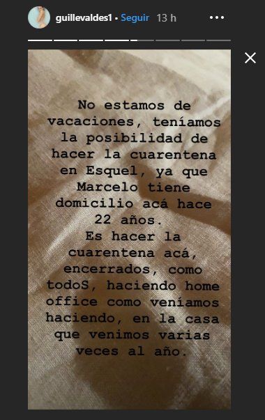 “No estamos de vacaciones, teníamos la posibilidad de hacer la cuarentena en Esquel, ya que Marcelo tiene domicilio acá hace 22 años. Es hacer la cuarentena acá, encerrados, como todos, haciendo home office, como veníamos haciendo, en la casa a la que venimos varias veces al año”, sostuvo Guillermina Valdés en las historias de su Instagram.
