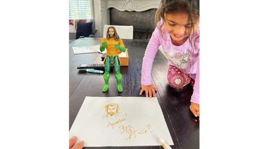 Luego, publicó una foto de Tia Giana sonriendo ante un dibujo de Aquaman junto a la figura de acción del superhéroe. "Esto se está volviendo ridículo. Para el cumpleaños de Tia insistió en que AquaMan se uniera a nosotros para desayunar - y luego después de comer, le pidió a papá que dibujara a AquaMan para poder ENMARCARLO y colgarlo en su habitación".
