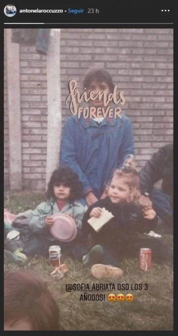 Antonela Roccuzzo es la mujer argentina con más seguidores en la red social Instagram (12 millones) y sus fotos tienen mucha repercusión. Hoy generó impacto con una imagen espectacular, Antonela subió una historia a Instagram de aproximadamente de tres años, aparece sentada en un jardín junto con su amiga tomando unas bebidas cola en lata, con un sandwich de miga en la mano. "Amigas por siempre", fue la frase que eligió la rosarina.