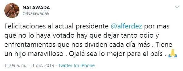 "Felicitaciones al actual presidente @alferdez por más que no lo haya votado hay que dejar tanto odio y enfrentamientos que nos dividen cada día más. Tiene un hijo maravilloso. Ojalá sea lo mejor para el país", escribió contundente.
