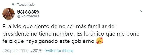 Aunque luego aclaró sin tapujos: "El alivio que siento de no ser más familiar del Presidente no tiene nombre. Es lo único que me pone feliz que haya ganado este gobierno".