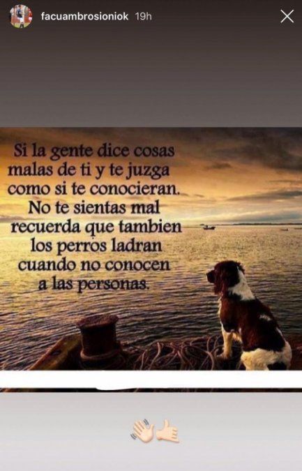 En cuanto a la segunda: “Si la gente dice cosas malas de ti y te juzga como si no te conocieran, no te sientas mal. Recuerda que los perros también ladran cuando no conocen a las personas”, cerró Ambrosioni.