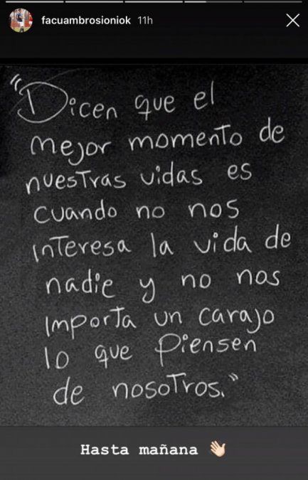 Mas tarde, Facundo compartió dos reflexiones en sus Stories de Instagram. “Dicen que el mejor momento de nuestras vidas es cuando no nos interesa la vida de nadie y no nos importa un carajo lo que piensen de nosotros”, dice la primera.
