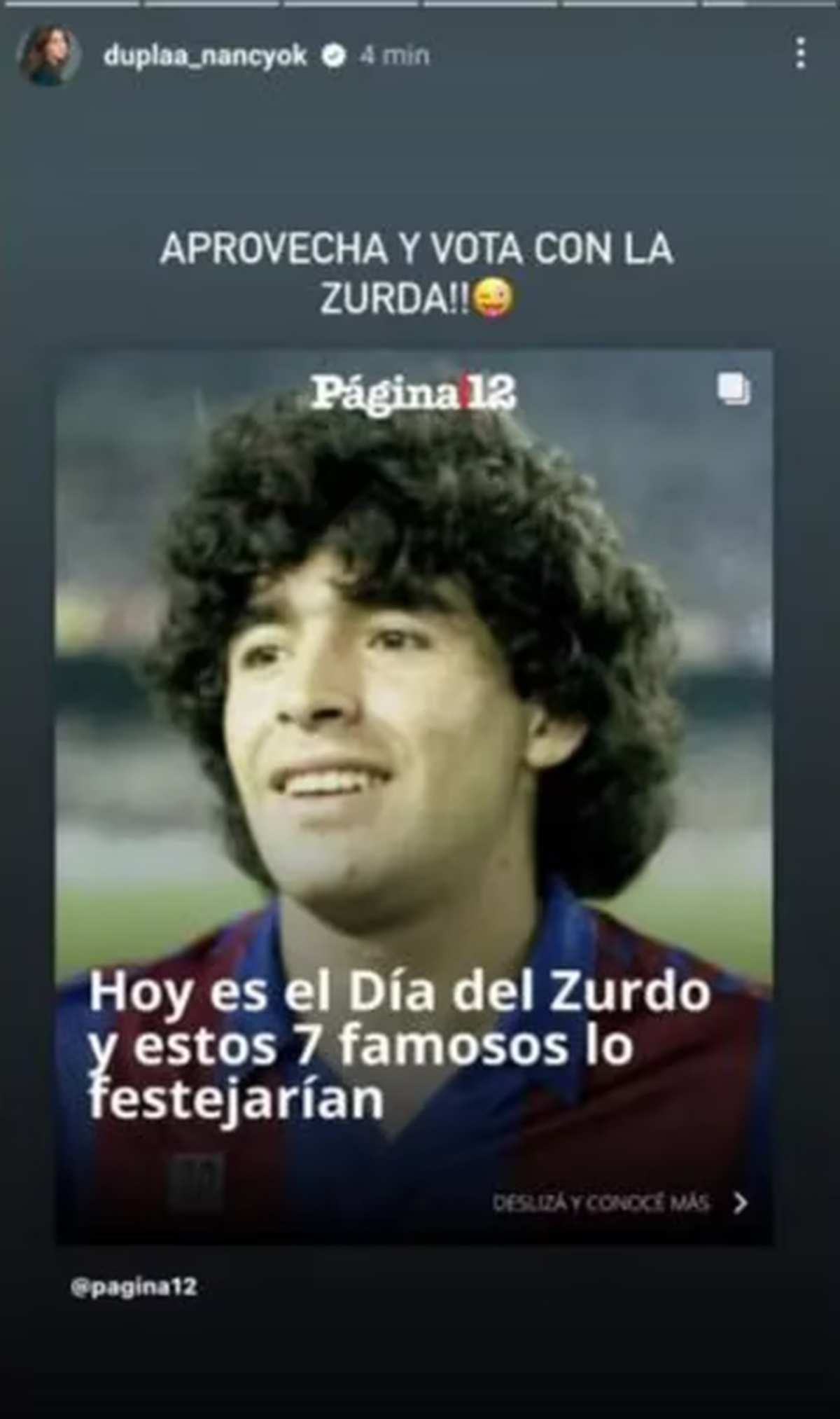 La actriz subió una foto de Diego Maradona haciendo alusión al Día Mundial del Zurdo, día el cual se celebra cada 13 de agosto, del mismo modo aprovecho para expresar su ideología política. "Aprovechá y votá con la zurda", escribió.