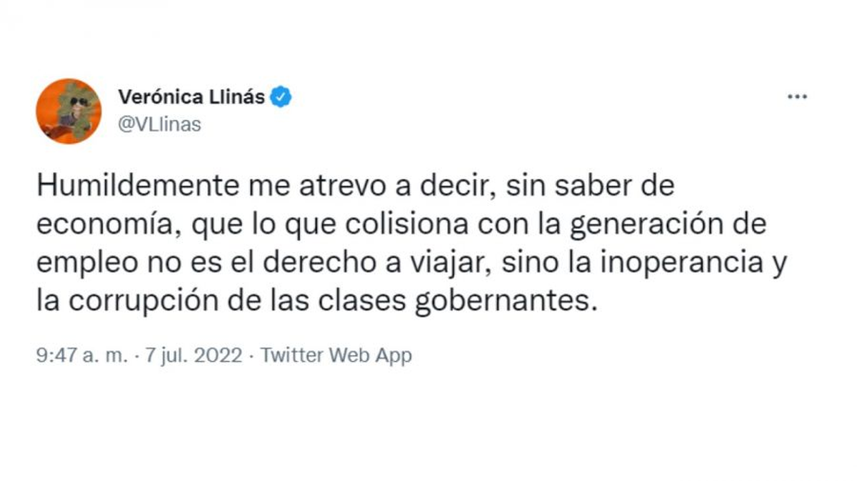 Luego de la entrevista en "A dos voces" (TN) de Silvina Batakis, donde afirmó que "el derecho a viajar colisiona con el derecho a los puestos de trabajo", generando repudio en gran parte de los argentinos; Llinás reaccionó en contra de dicho pensamiento y escribió: "Humildemente me atrevo a decir, sin saber de economía, que lo que colisiona con la generación de empleo no es el derecho a viajar, sino la inoperancia y la corrupción de las clases gobernantes".