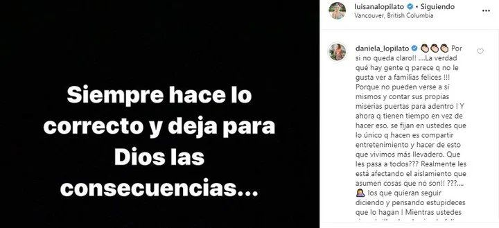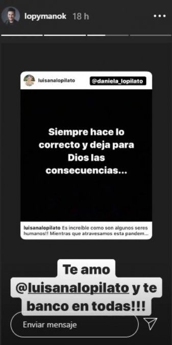 "Te amo Luisana Lopilato y te banco en todas", comentó el actor para respaldar a su hermana, tras compartir en sus historias de Instagram el posteo que Luisana compartió con todos sus seguidores para desmentir las versiones de violencia y defender a su marido de las etiquetas de "machista" y "maltratador" que le adjudicaron millones de personas luego de ver destratos y maltratos por cámara.
