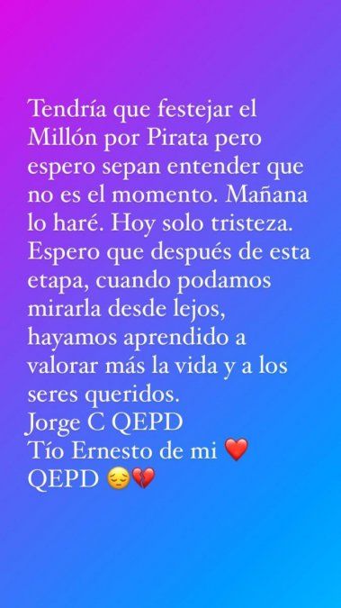 A través de sus historias de Instagram, la participante de ShowMatch, La Academia agradeció por el apoyo brindado a su último tema, pero aclaró que no era el momento de festejar. “Tendría que festejar el millón por ‘Pirata’ pero espero sepan entender que no es el momento. Mañana lo haré”, comenzó explicando La Princesita.