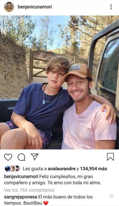En sus redes, Benjamín Vicuña saludó a su hijo con una foto donde están abrazados y escribió: "Feliz cumpleaños, mi gran compañero y amigo. Te amo con toda mi alma".