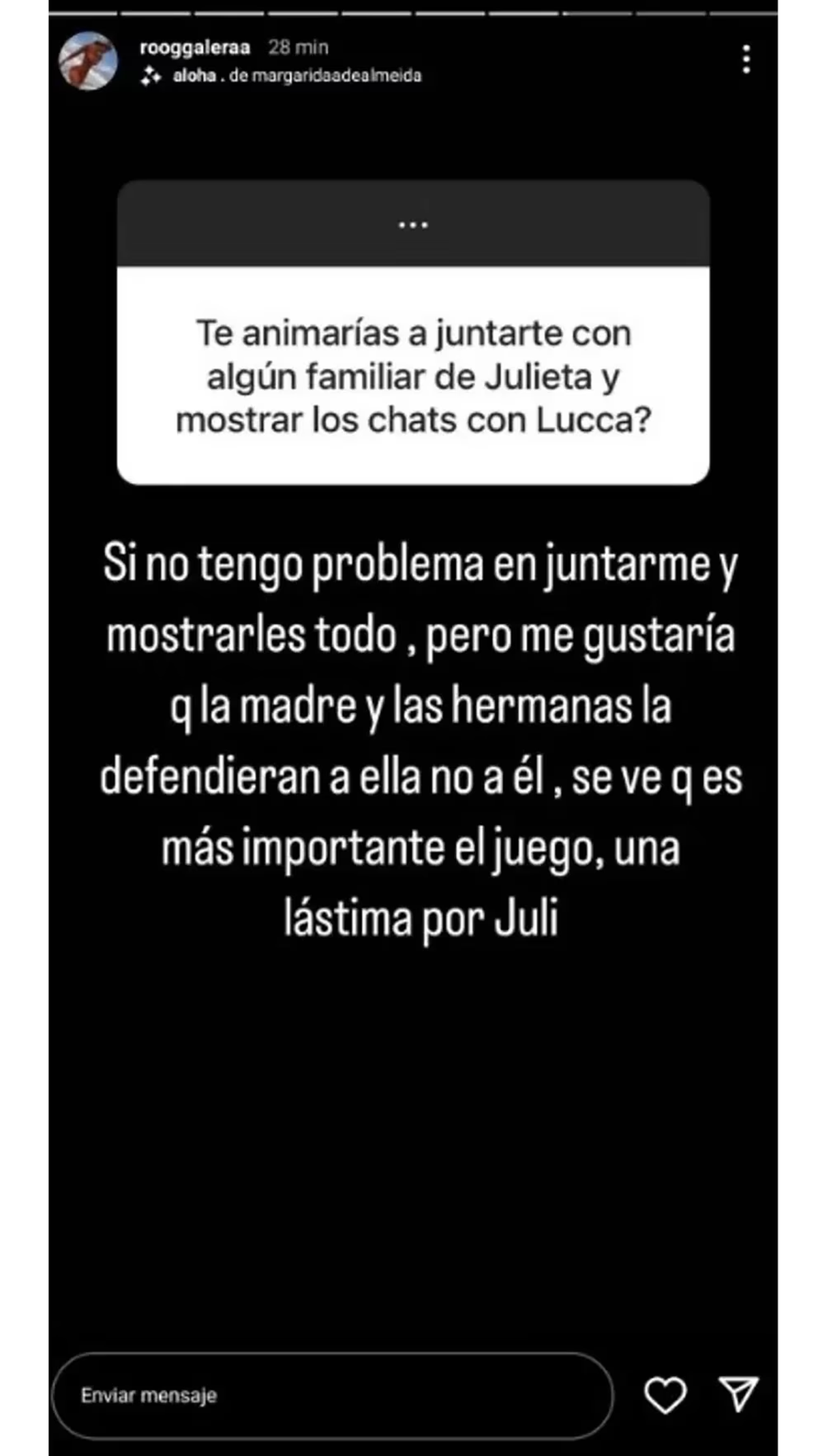 Otro seguidor le preguntó: “¿Te animarías a juntarte con algún familiar de Julieta y mostrar los chats con Lucca?”. Rocío contestó lo siguiente: “Sí, no tengo problema en juntarme y mostrarles todo, pero me gustaría que la madre y las hermanas la defendieran a ella, no a él. Se ve que es más importante el juego. Una lástima por Juli”.