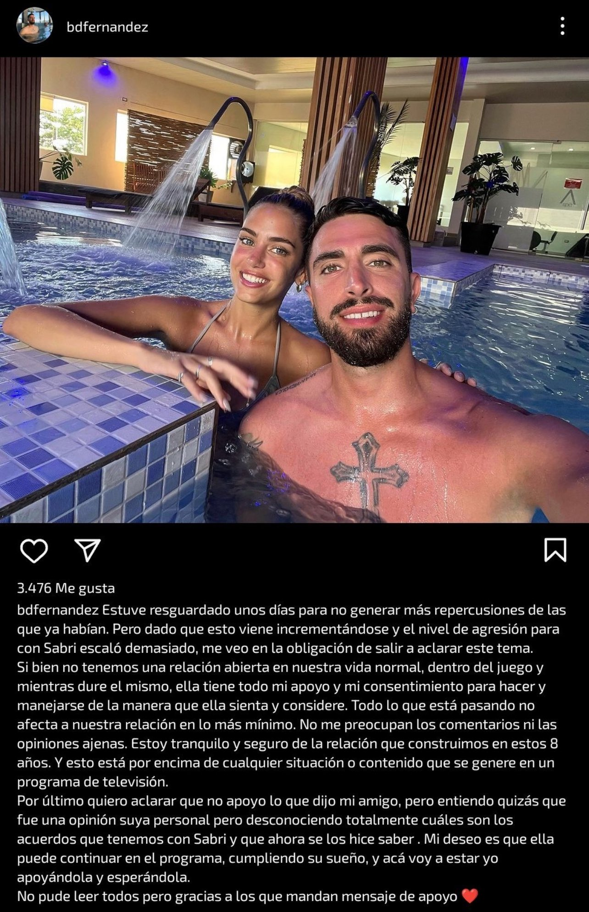 Y agregó: “Todo lo que está pasando no afecta a nuestra relación en lo más mínimo. No me preocupan los comentarios ni las opiniones ajenas. Estoy tranquilo y seguro de la relación que construimos en ocho años. Y esto está por encima de cualquier situación o contenido que se genere en un programa de televisión”.