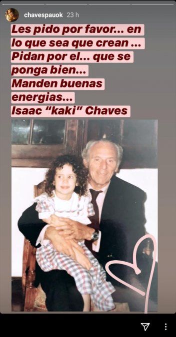 “Les pido por favor... en lo que sea que crean... Pidan por él, que se ponga bien. Manden buenas energías... Isaac ‘Kaki’ Chaves”, escribió la conductora, demostrando así que el hombre de 94 años no está atravesando un buen momento.