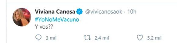 Viviana Canosa lanzó un polémico mensaje en Twitter que despertó fuertes críticas en la red social. “#YoNoMeVacuno ¿¿Y vos??”, escribió Canosa dejando en claro que no se aplicará la vacuna Sputnik V cuando llegue al país e impulsando un hashtag que incluso la llevó a ser Trending Topic en Twitter debido a la gran cantidad de comentarios que generó su posteo.