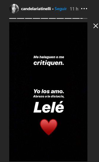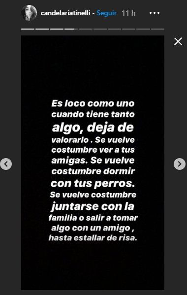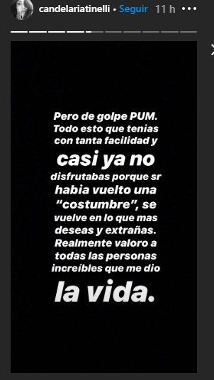 "Es loco como cuando uno tiene tanto algo deja de valorarlo. Se vuelve costumbre ver a tus amigas, dormir con tu perro, se vuelve costumbre juntarse con la familia o salir a tomar algo con un amigo y estallarte de risa", comenzó "Lelé" en un descargo que fue dirigido para sus 4 millones de seguidores.