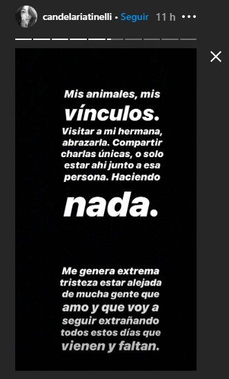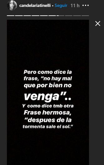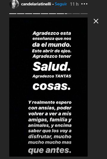 A sus sentidas palabras agregó: "Me genera extrema tristeza estar alejada de gente que amo y que voy a seguir extrañando todos estos días que vienen y faltan. Pero como dice la frase 'no hay mal que por bien no venga' y como dice también otra frase hermosa 'después de la tormenta sale el sol' . Agradezco esta enseñanza que nos da el mundo, este abrir de ojos".