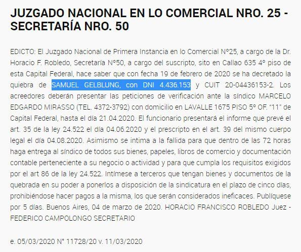 “El Juzgado Nacional de Primera Instancia en lo Comercial Nº25, a cargo de la Dr. Horacio F.Robledo, Secretaría Nº50, a cargo del suscripto, sito en Callao 635 4º piso de esta Capital Federal, hace saber que con fecha 19 de febrero de 2020 se ha decretado la quiebra de Samuel Gelblung”, indica el documento.