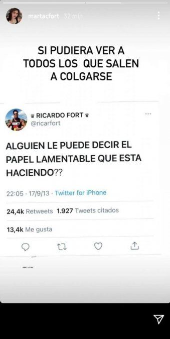 Martita citó un tuit de su padre en el que resaltó "¿Alguien le puede decir el papel lamentable que está haciendo?". Sumadas a esas palabras, la hija de Fort agregó: "Si pudiera ver a todos los que salen a colgarse".