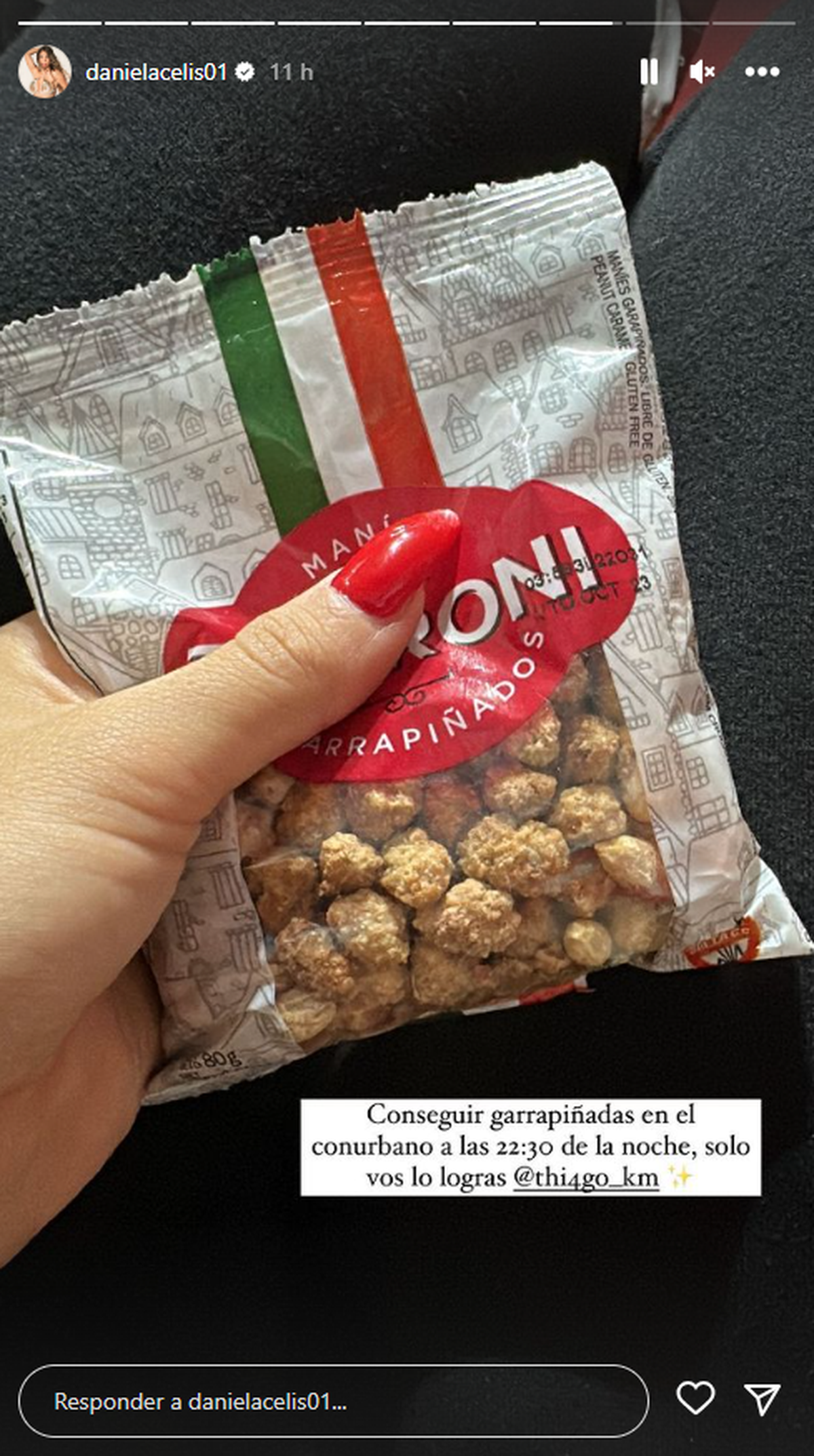 “Conseguir garrapiñadas en el conurbano a las 22:30 de la noche, solo vos lo logras”, escribió la mediática este miércoles en una foto y mostró el paquete de snacks dulces que le compró su pareja.