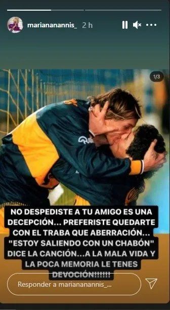 En una historia de Instagram, la rubia acusó a Caniggia de no participar del velatorio del ídolo del fútbol en la Casa Rosada por quedarse junto a su pareja. "No despediste a tu amigo, es una decepción. Preferiste quedarte con el traba, qué decepción", disparó sin filtro.