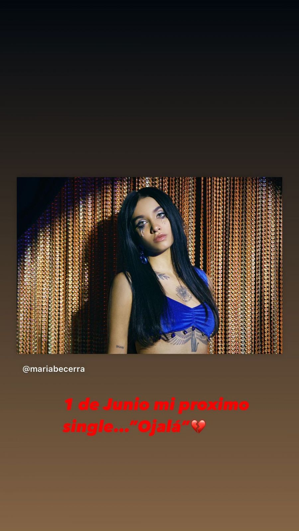A solo horas de que Rusherking confirmara su relación con la China Suárez, saltó María Becerra con una historia en Instagram con el corazón roto. Allí promociona su nuevo single “Ojalá”, con una picante letra. “Ojalá no te haga lo que me hiciste aquella vez. Ojalá que te arrepientas siempre que quieras volver”. El tema será estrenado hoy, 1ero de junio, en todas las plataformas digitales a las 8pm hora de Argentina.