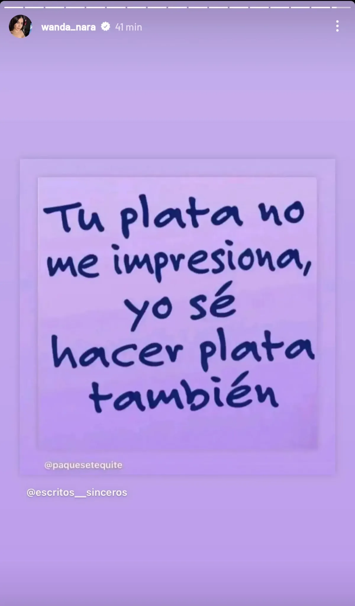 “Tu plata no me impresiona, yo sé hacer plata también”, dice la publicación que la mediática subió a sus redes sociales en las últimas horas en medio de su distanciamiento con Mauro Icardi. Al parecer, Wanda no se habría tomado de buena manera el polémico ida y vuelta que él tuvo con la diva.