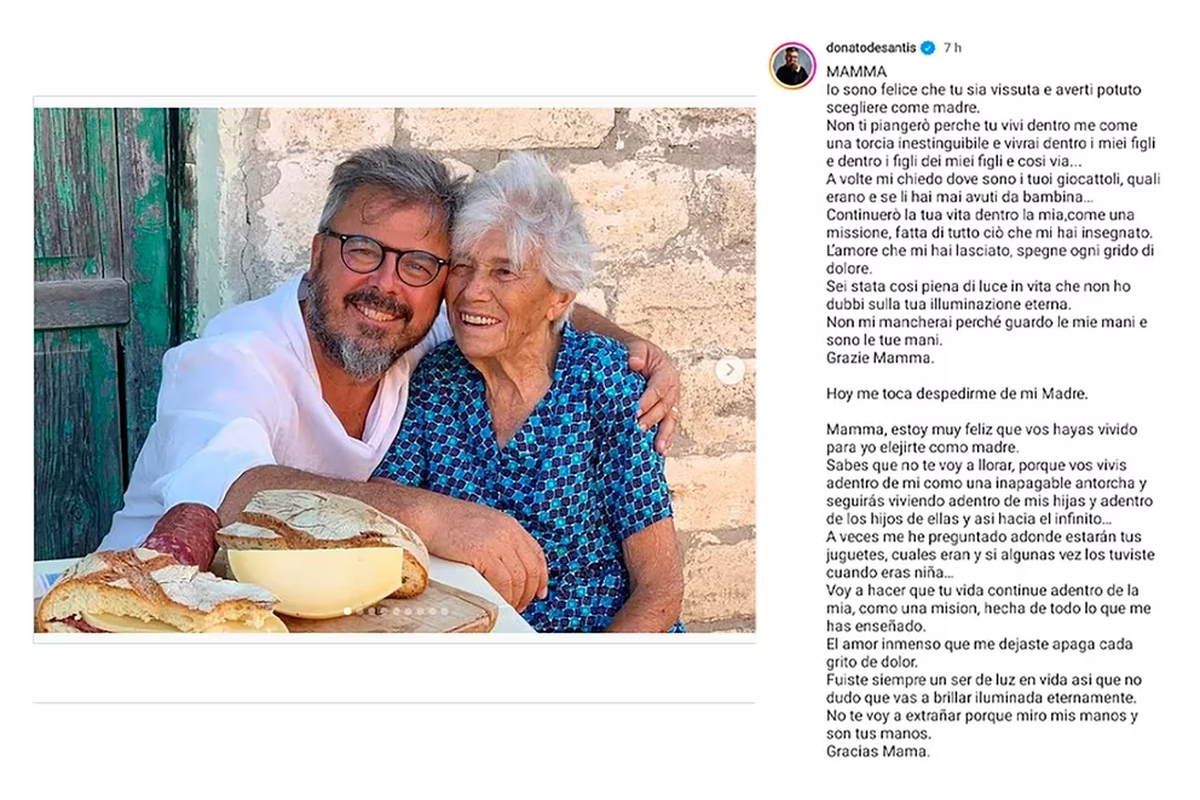 Este domingo, Donato de Santis se enteró de que su mamá, María, había muerto. La mujer, de 93 años, vivía en La Puglia junto a sus hermanos y el resto de la familia. Y llevaba tiempo luchando contra los achaques de la edad.