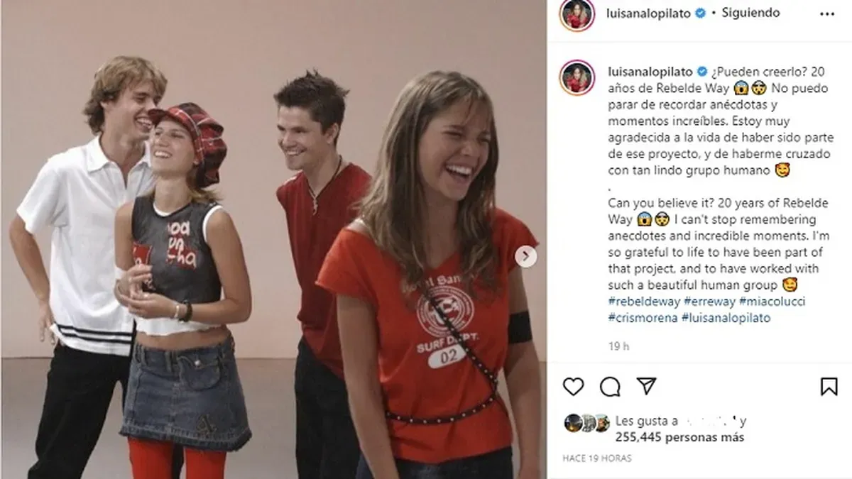 "¿Pueden creerlo? 20 años de Rebelde Way... No puedo parar de recordar anécdotas y momentos increíbles. Estoy muy agradecida a la vida de haber sido parte de ese proyecto, y de haberme cruzado con tan lindo grupo humano", posteó desde su redes sociales Lopilato, junto a dos emojis de asombro por el inexorable paso del tiempo y a la vez emoción por todo lo vivido.