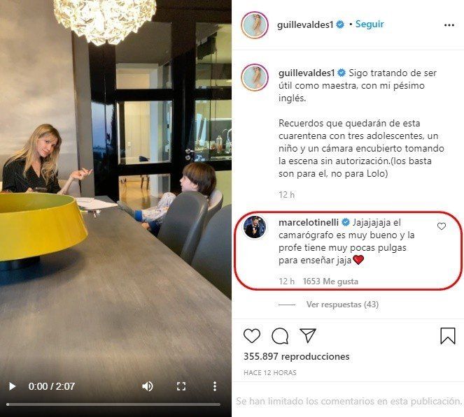 En la publicación se la puede ver a Guillermina enseñándole inglés a Lorenzo, su hijo con Marcelo, en su casa. "Sigo tratando de ser útil como maestra, con mi pésimo inglés. Recuerdos que quedarán de esta cuarentena con tres adolescentes, un niño y un cámara encubierto tomando la escena sin autorización (los 'basta' son para el, no para Lolo)", escribió por debajo del contenido.