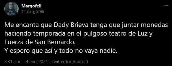 No obstante, sus haters se hicieron presentes en las redes sociales y dejaron bien en claro que les gustaría que nadie lo vaya a ver. “Me encanta que Dady Brieva tenga que juntar monedas haciendo temporada en el pulgoso teatro de Luz y Fuerza de San Bernardo. Y espero que así y todo no vaya nadie”, escribió un usuario de Twitter.