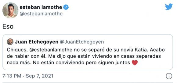 EL periodista tuiteó “chiques, Esteban Lamothe no se separó de su novia Katia. Acabo de hablar con él”.