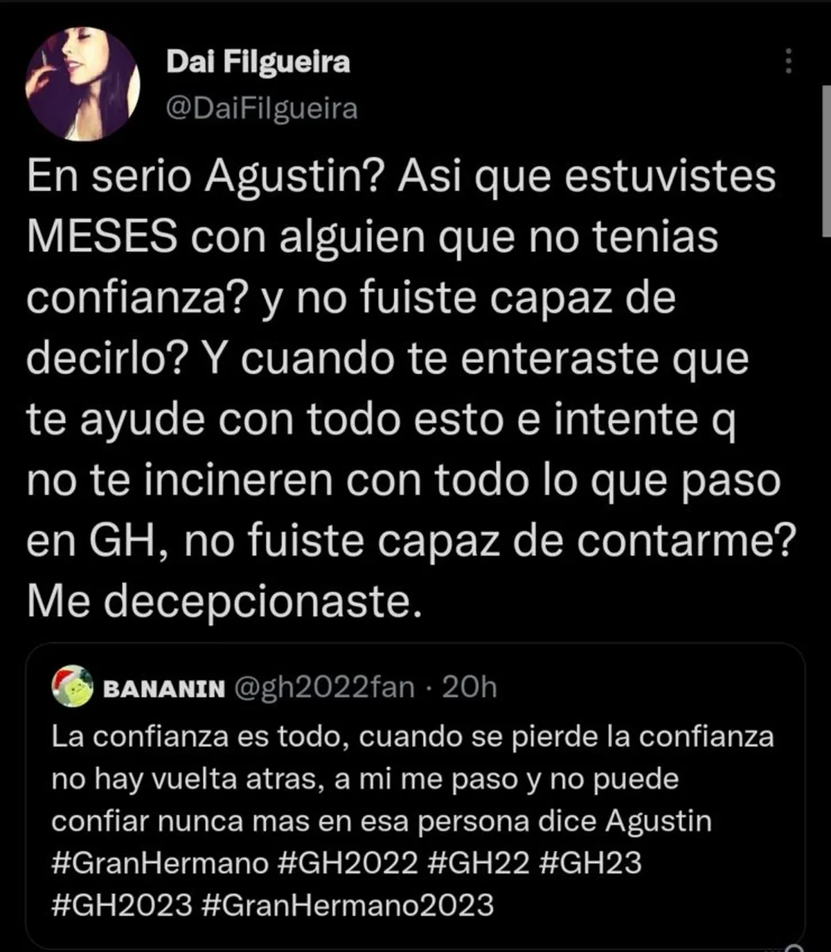 Tras las palabras de Agustín, su ex, Dai Filgueira, arrojó en las redes: "¿En serio, Agustín? ¿Así que estuviste MESES con alguien que no tenías confianza y no fuiste capaz de decirlo? ¿Y cuando te enteraste de que te ayudé con todo esto e intenté que no te incineren con todo lo que paso en Gran Hermano, no fuiste capaz de contarme? Me decepcionaste".
