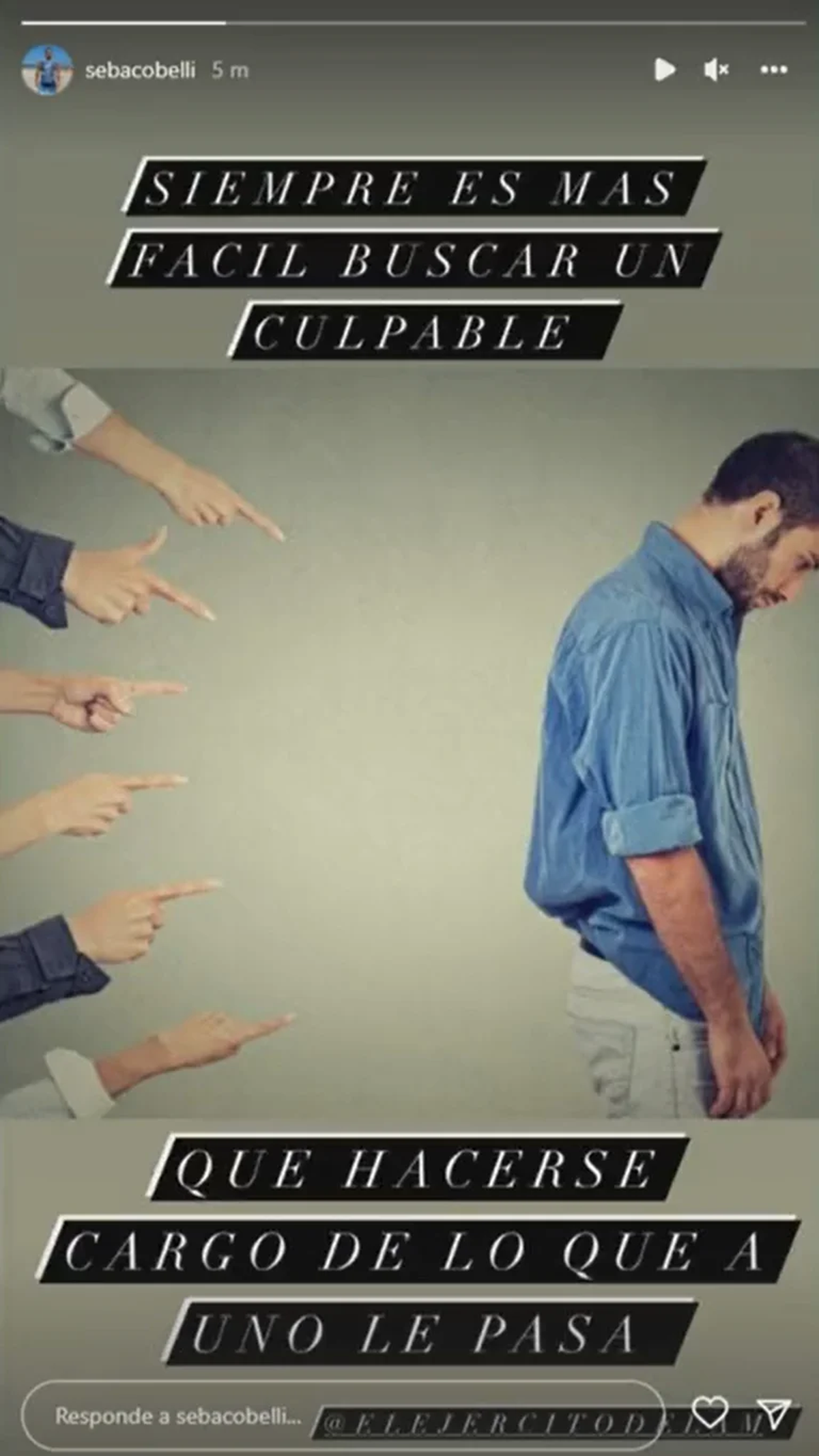 “Es muy difícil, y digo esto pero pienso que si lo está mirando no me conviene”, deslizó al mismo tiempo en que Yanina Latorre pedía la palabra para darle una noticia que generó que se quebrara en vivo. “Acaba de poner algo en Instagram, una historia con una imagen donde todos señalan a un hombre y dice: ‘Siempre es más fácil buscar un culpable que hacerse cargo de lo que a uno le pasa. Lo está viendo porque arrobó al programa’”, le contó la panelista. Tras un breve silencio y la mirada que empezaba a llenarse de lágrimas, lamentó la actitud de Cobelli.