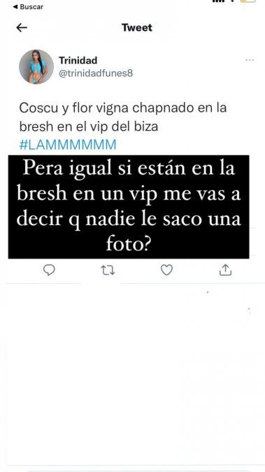 “Coscu y Flor Vigna chapando en la BRESH en el vip del Biza #LAMMMMM” .