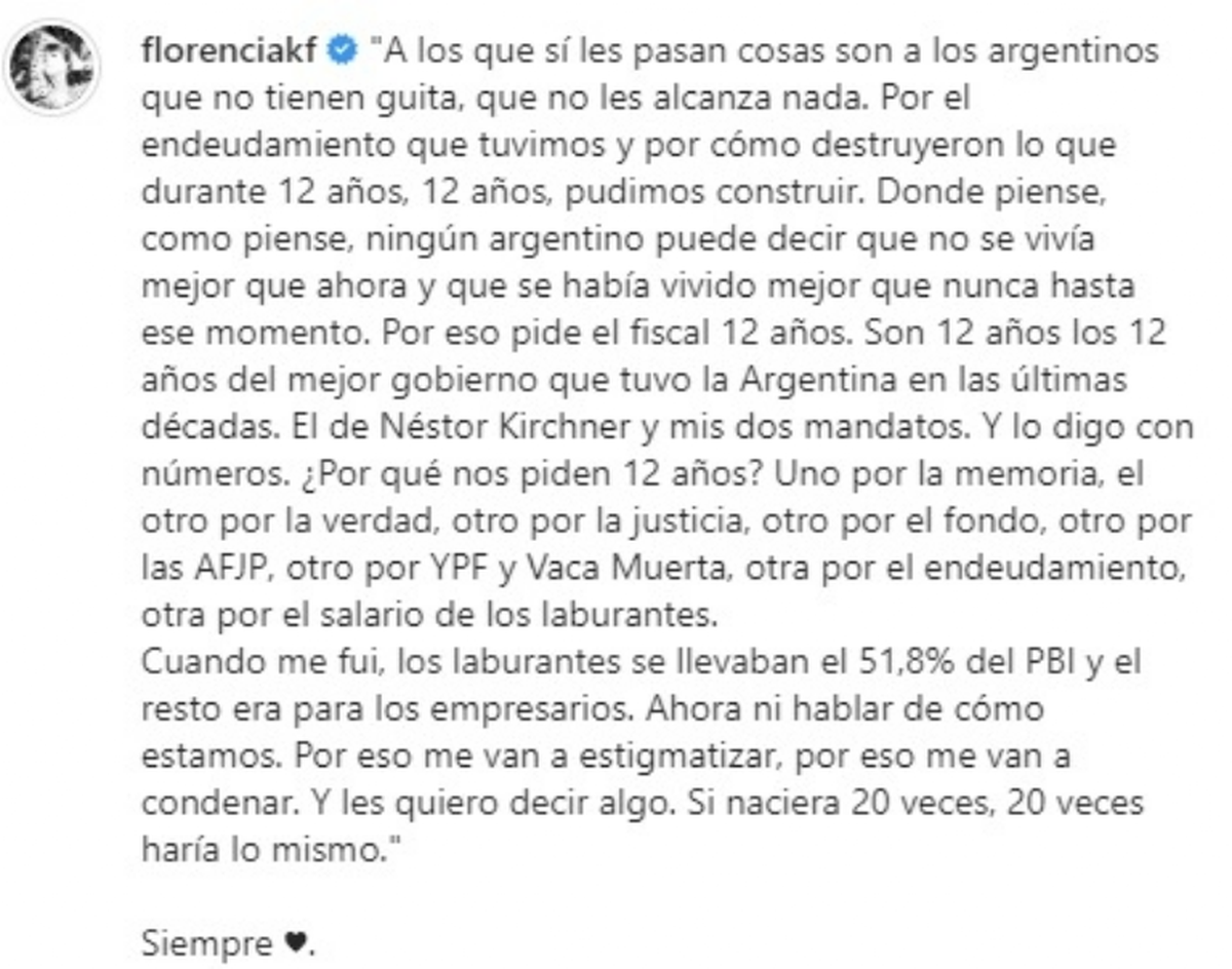 Este martes, Florencia Kirchner también recurrió a su cuenta de Instagram para referirse a la exposición de su madre. Florencia compartió un fragmento de la intervención y su transcripción escrita donde su madre asegura: “Si naciera 20 veces, 20 veces haría lo mismo”. La joven apenas agregó la palabra “Siempre” junto a un corazón para bancar a su madre.