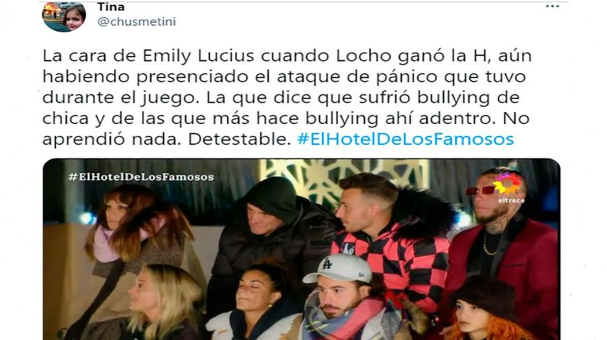 La influencer conmovió a todos en la casa cuando contó que, tanto ella como su hermana, habían sido víctimas de bullying durante su niñez. Sin embargo, algunos espectadores del reality han quedado impresionados con la actitud que ha tenido Emily con Locho Loccisano, quien ha manifestado el malestar que lo aqueja por las constantes burlas y ataques que vendrían en gran medida por parte de Martín Salwe. "La que dice que sufrió de bullying de chica y de las que más hace bullying ahí adentro. No aprendió nada. Detestable", expresó un internauta en contra de la actitud de Emily en "El Hotel de los Famosos".