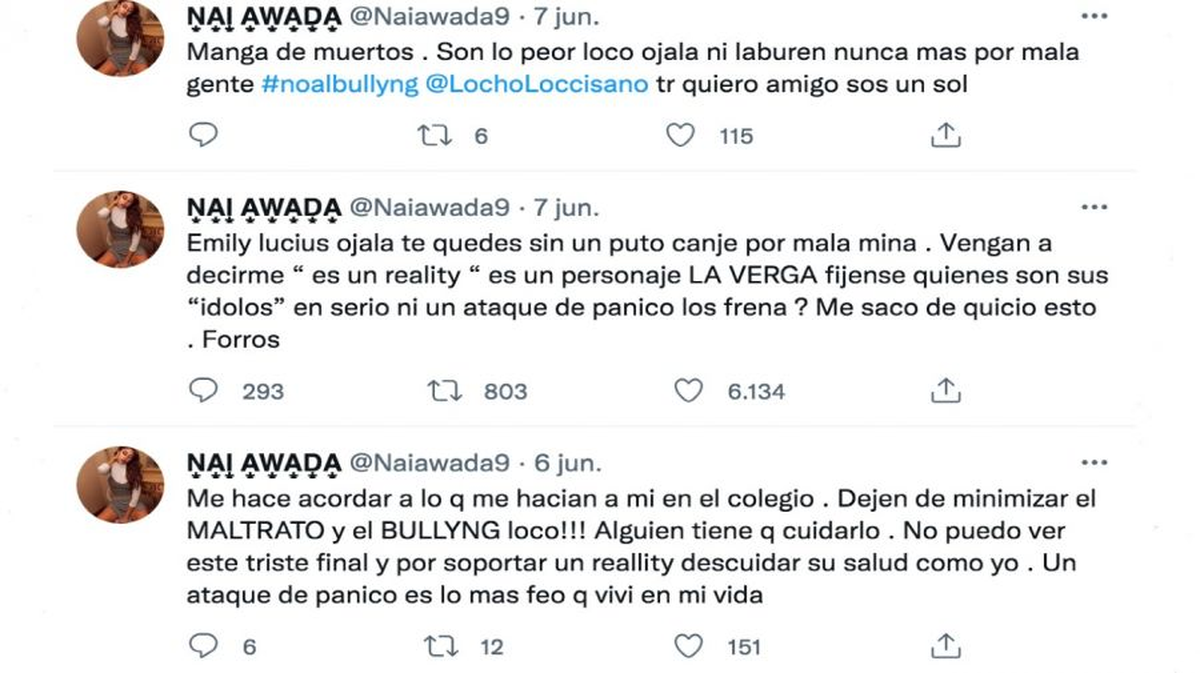 Tras ver los últimos episodios del programa conducido por Pampita y el Chino Leunis, Nai Awada apuntó en sus redes sociales contra Emily Lucius y defendió a Locho Loccisano por todos los malos momentos que ha vivido dentro de reality: "Me hace acordar a lo que me hacían a mí en el colegio. ¡Dejen de minimizar el MALTRATO y el BULLYING, loco!".
