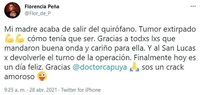 Finalmente, este miércoles a la mañana, Norma fue operada y Flor contó que fue con éxito: "Mi madre acaba de salir del quirófano. Tumor extirpado, cómo tenía que ser. Gracias a todxs lxs que mandaron buena onda y cariño para ella. Y al San Lucas x devolverle el turno de la operación. Finalmente hoy es un día feliz. Gracias @doctorcapuya. sos un crack amoroso", manifestó.