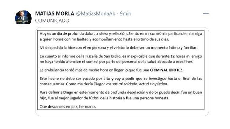 Para cerrar ”este momento de profunda desolación y dolor” agregó: “Fue un buen hijo, fue el mejor jugador de fútbol de la historia y fue una persona honesta. Que descanses en paz, hermano”.Aunque siempre fueron muy cercanos y su relación, más que de abogado y cliente, había pasado a ser de amistad, en los últimos meses y en parte por la pandemia -ya que Diego estaba dentro del denominado grupo de riesgo-, Morla y el Diez no se estaban viendo tan frecuentemente.