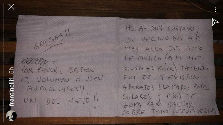"Hola, soy Gustavo, tu vecino del 4P. Más allá del tipo de música (a mi me gusta más el rock) también fui DJ. Y existen unos aparatos llamados auriculares y pisos de goma para saltar, sobre todo después de las 22 hs.", así comenzaba la carta que recibió Fran Tinelli en el departamento que comparte junto a su hermana Juanita y su mamá, Paula Robles.