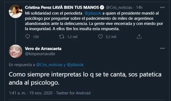 "Porque no te solidarizas también con los periodistas de @C5N agredidos en diferentes marchas. Cómo hacés lobby para poder estar en El 13", "Como siempre, interpretás lo que se te canta, sos patética, andá al psicólogo", arremetieron. Otros, salieron a defenderla."Me hiciste acordar cuando te mandó a vos a leer la Constitución. El equivocado siempre es el otro (Hay que tomarlo como de quien viene)", dispararon.