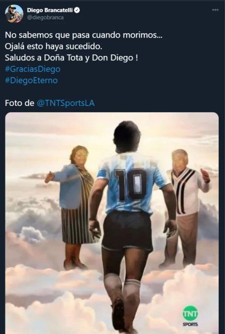 Diego Brancatelli mostró una imagen del cielo en el que los padres de "Pelusa", Doña Tota y Don Diego, reciben a su hijo, vestido con la camiseta que utilizó en el emblemático Mundial 1986 para acompañarlo en el camino. "No sabemos que pasa cuando morimos… Ojalá esto haya sucedido. Saludos a Doña Tota y Don Diego ! #GraciasDiego #DiegoEterno", manifestó.