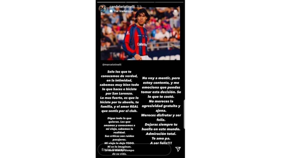 Cande Tinelli recurrió a su cuenta de Instagram en las últimas horas para defender a su papá, Marcelo Tinelli, de las críticas por su renuncia a la presidencia de San Lorenzo de Almagro. "Solo los que te conocemos de verdad, en la intimidad, sabemos muy bien todo lo que hacés e hiciste por San Lorenzo. Lo más fuerte es que lo hiciste por tu abuelo, tu familia, el amor REAL que sentís por el club", comenzó la empresaria textil mediante un posteo en sus historias de Instagram.