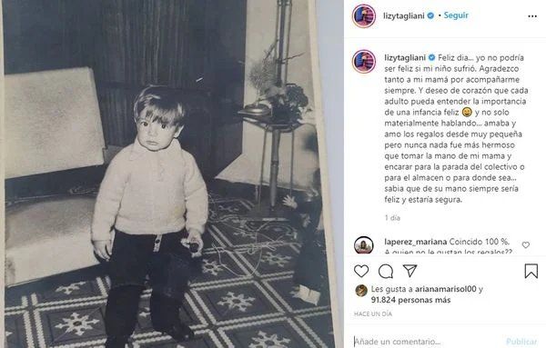 "Y deseo de corazón que cada adulto pueda entender la importancia de una infancia feliz y no solo materialmente hablando", siguió Lizy Tagliani.