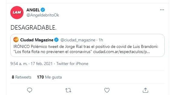 "CONFIRMADO: LOS FLOTA FLOTA NO PREVIENEN EL #CORONAVIRUS", ESCRIBIÓ RIAL, SIN MENCIONAR A BRANDONI. Y ÁNGEL REACCIONÓ CON CONTUNDENCIA. "DESGRADABLE".