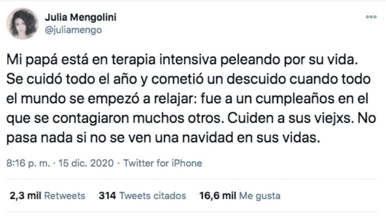 "Mi papá está en terapia intensiva peleando por su vida. Se cuidó todo el año y cometió un descuido cuando todo el mundo se empezó a relajar: fue a un cumpleaños en el que se contagiaron muchos otros", reveló. Y concluyó el texto con un consejo y una reflexión: "Cuiden a sus viejos. No pasa nada si no se ven una navidad en sus vidas", explicó Mengolini en sus redes.