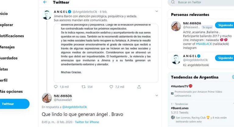 Ángel de Brito fue uno de los periodistas que compartió el comunicado a través de Twitter: “Jimena Barón con atención psicológica, psiquiátrica y sedada. Sus asesores mandan este comunicado”, escribió el conductor de Los Ángeles de la Mañana.