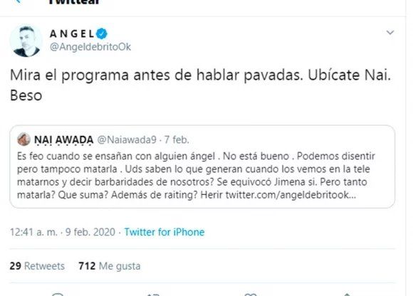 A esto Ángel le contestó: “Mira el programa antes de hablar pavadas. Ubícate Nai. Beso”, y la actriz ya había decidido no parar.